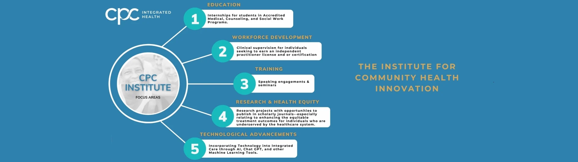 The Institute for Community Health Innovation delivers cutting-edge training, consultation and technology transfer to the physical health, substance use and mental health service delivery community. Our goal is to enhance equitable treatment outcomes for individuals who are underserved by the healthcare system. The CPC Institute is helping to transform integrated behavioral healthcare throughout New Jersey and beyond.