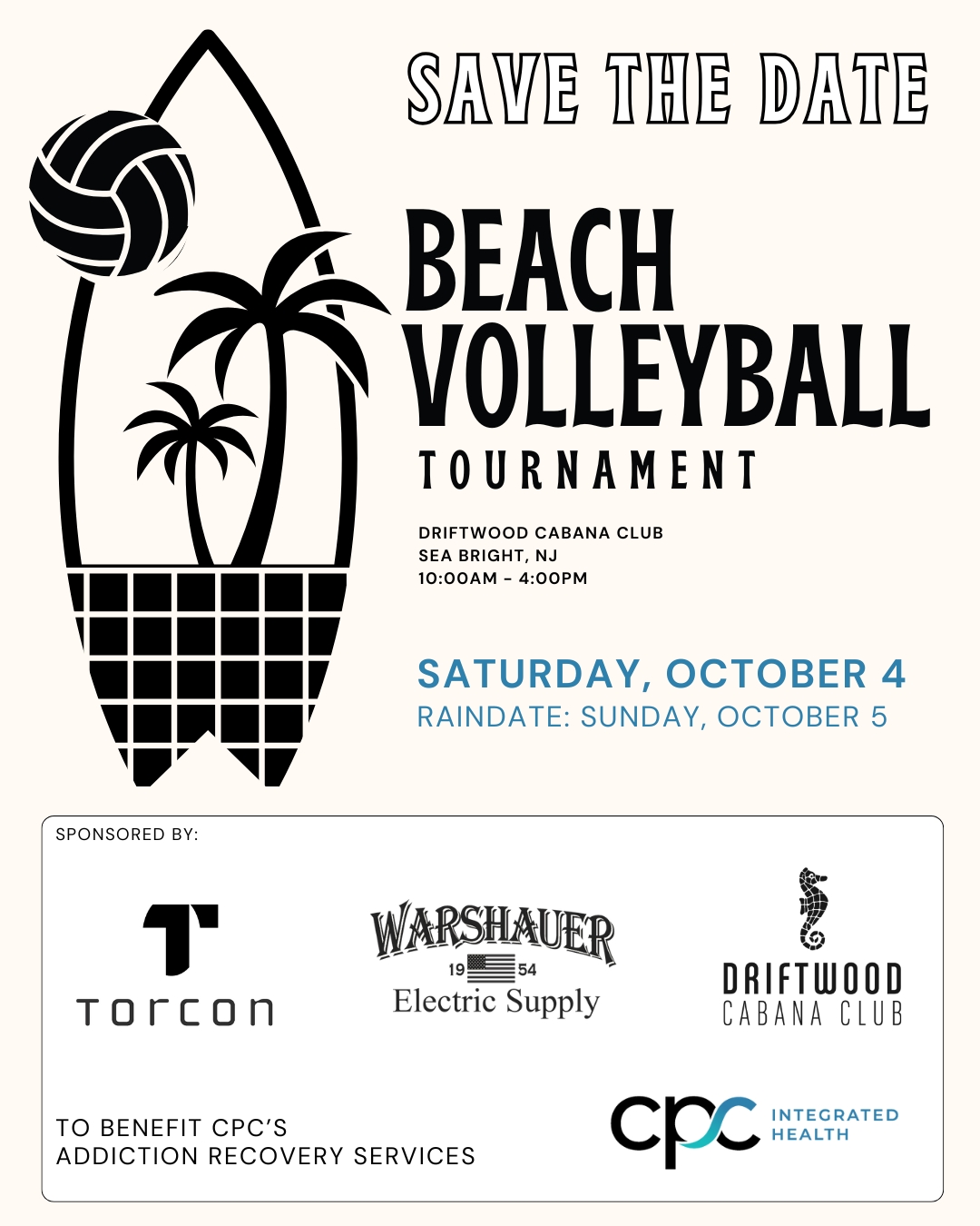 Details regarding the event……players arrive starting at 10:00am. We will have the welcome announcements and go over rules at 10:30. The games begin at 11:00am. The final brackets are typically played around 3:00pm. We anticipate 30+ teams and play bracket style and double elimination. Co-ed teams are welcomed in this 4 v 4 (6 player per team max) format. Spectators are free & there are activities available for the whole family. Enjoy the live band at the Tiki Bar, full menu, and watch the teams compete. It’s a great day for a terrific cause and we hope you will join us! Any questions, email llucarelli@cpcih.org or call 732.935.2226. Enclosed are sponsorship opportunities and registration details. Please register online: www.cpcintegratedhealth.org/volleyball-tournament